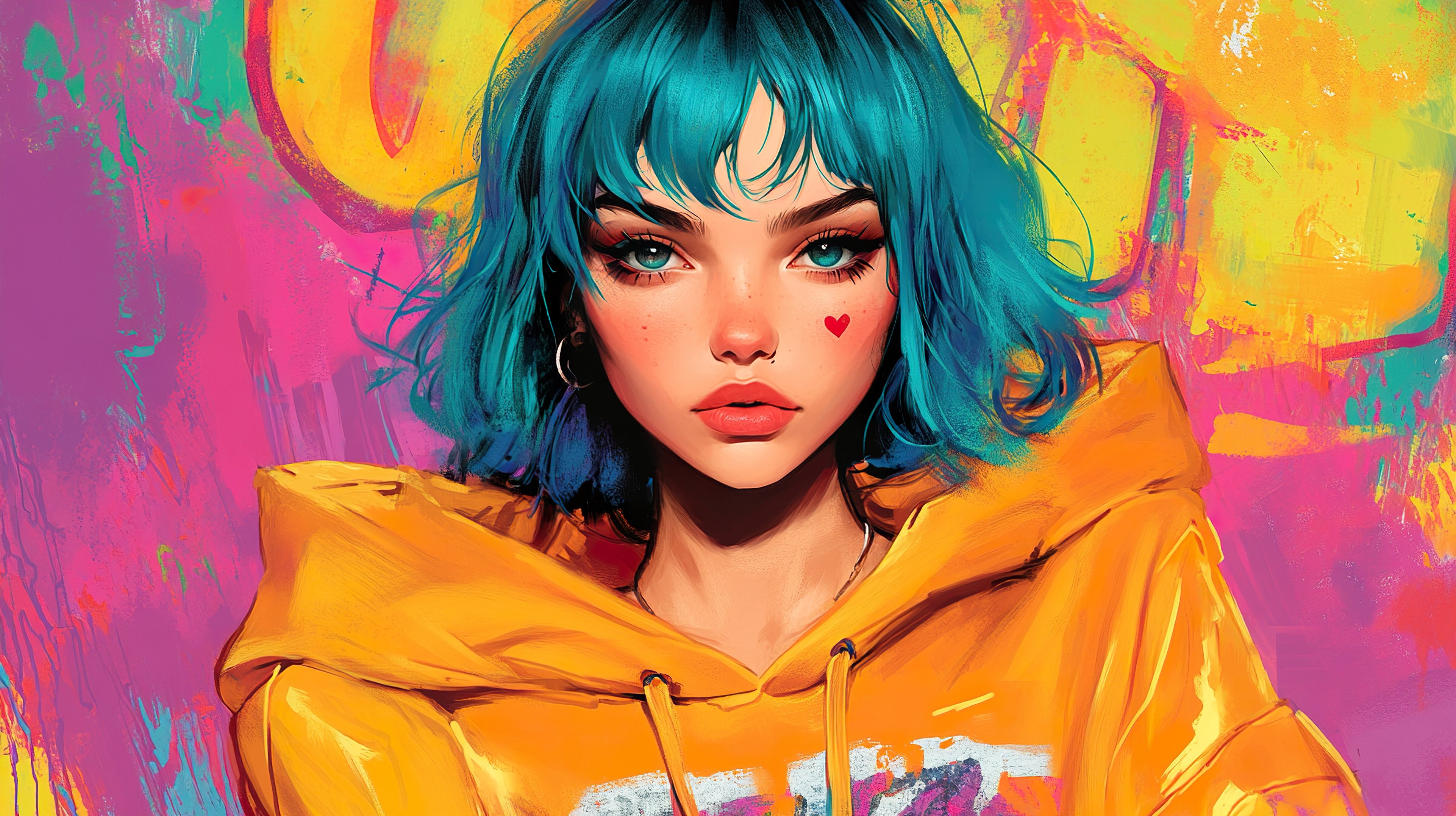 A striking illustration of a girl with a teal pixie cut, set against a vivid background, perfect for a unique desktop wallpaper.